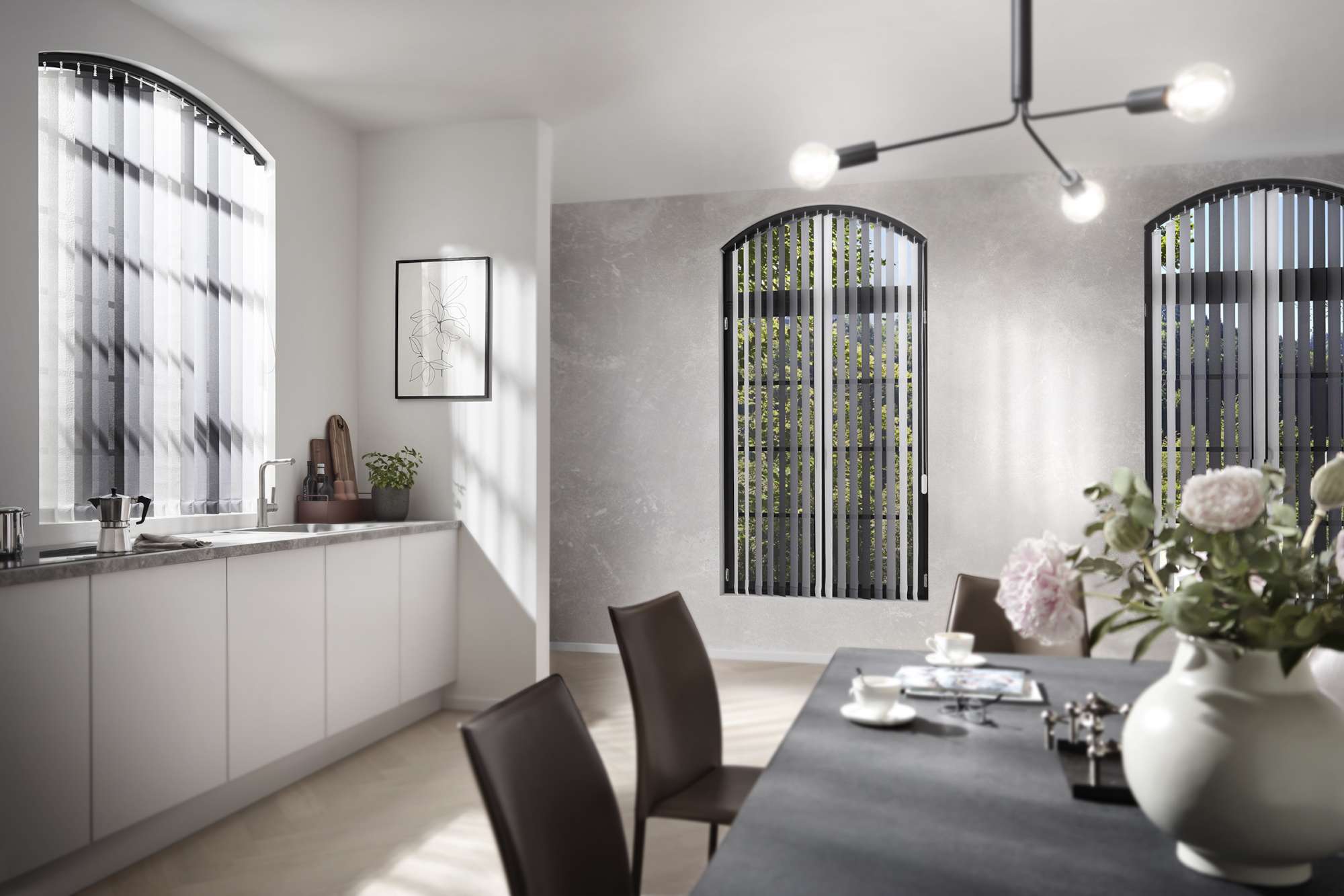 Flächenvorhänge und Lamellenanlagen schaffen klare Linien und elegante Strukturen. Besonders beliebt in modernen Wohnräumen, Wintergärten oder Büroflächen.